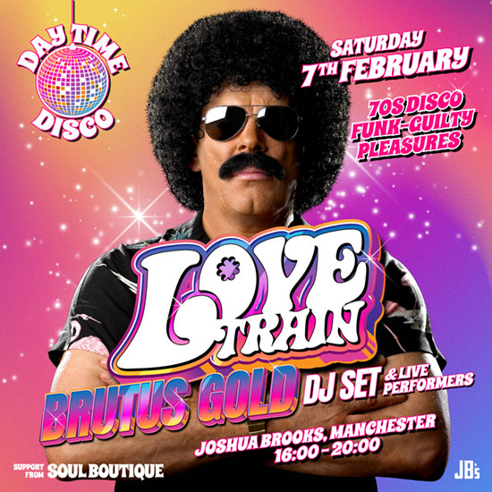 Love Train returns with a proper daytime disco session at Joshua Brooks, led by Brutus Gold. 70s disco, funk-guilty pleasures and soulful selections.