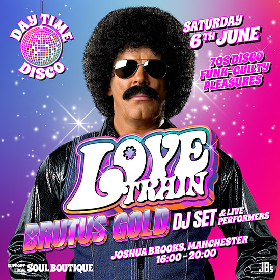 Brutus Gold brings the Love Train to Joshua Brooks for Day Time Disco. 70s disco, funk and guilty pleasures. DJ set with performers. Let's go.